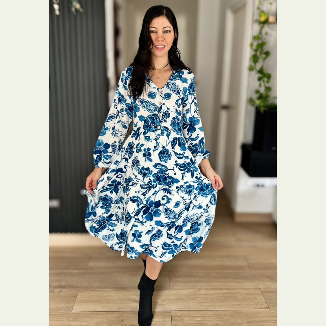 Nuestro vestido midi con botones frontales funcionales y cierre lateral es pura comodidad y movimiento. Tiene un vuelo increíble que da ese toque femenino y libre que amamos. Cuenta con forro interno en la falda.