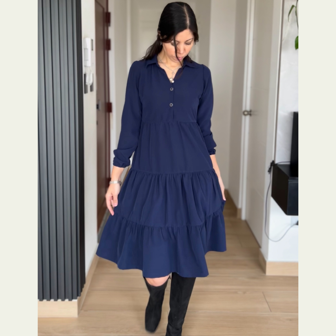 ¡Añade un toque de elegancia a tu guardarropa con este impresionante vestido! Con mangas largas y un cuello clásico. Este vestido ofrece una mezcla perfecta de estilo y comodidad.